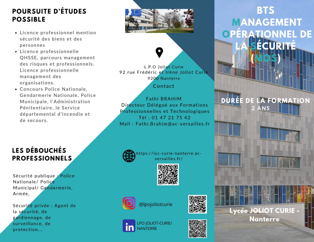 Brevet de Technicien Supérieur Management Opérationnel de la Sécurité Formation en Alternance sous contrat d’apprentissage • Nature du diplôme : diplôme national ou diplôme d’état de niveau 5 (anciennement III) • Durée de la formation : 2 ans (volume (...)